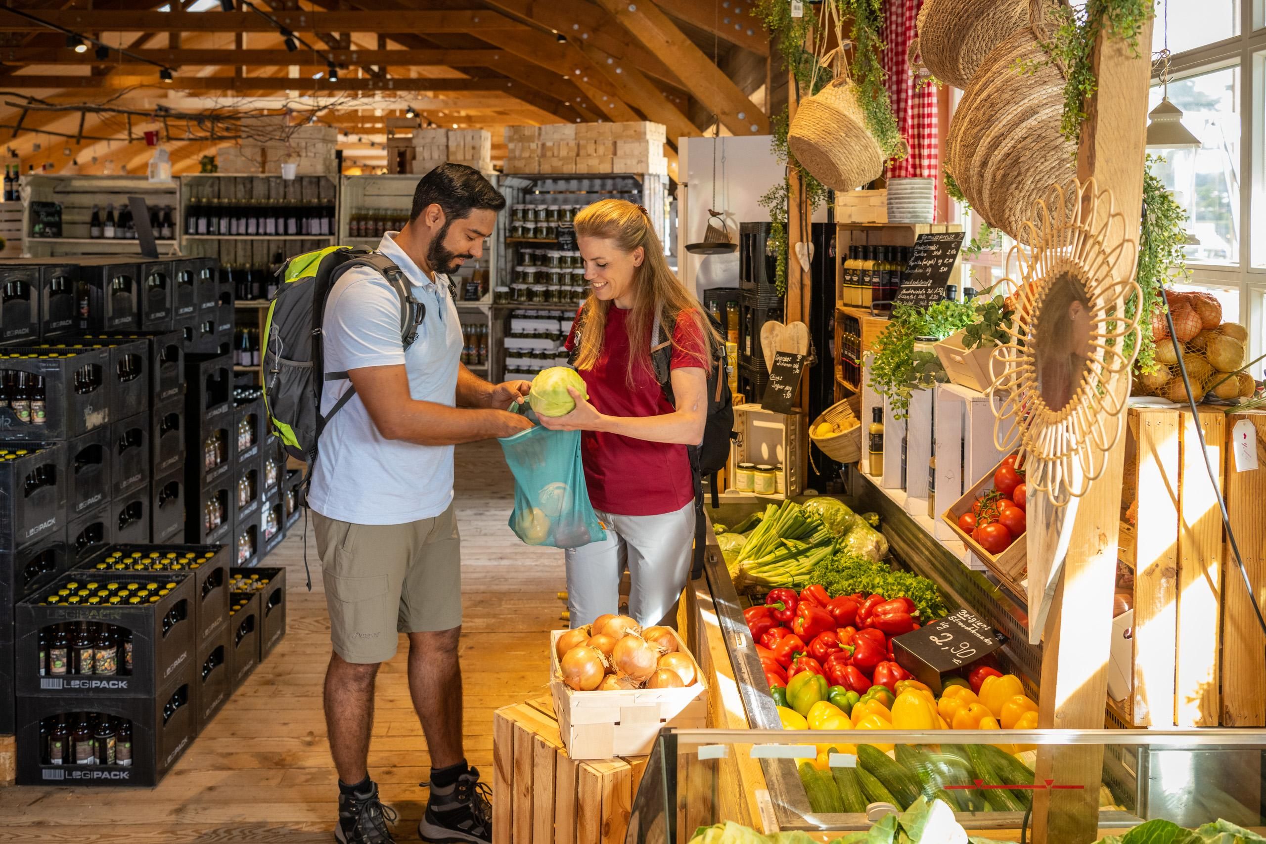 Das Warenangebot beinhaltet Obst und Gemüse, Käse, Frischfisch (bis 13:00 Uhr), Geflügel, Eier und Feinkost.