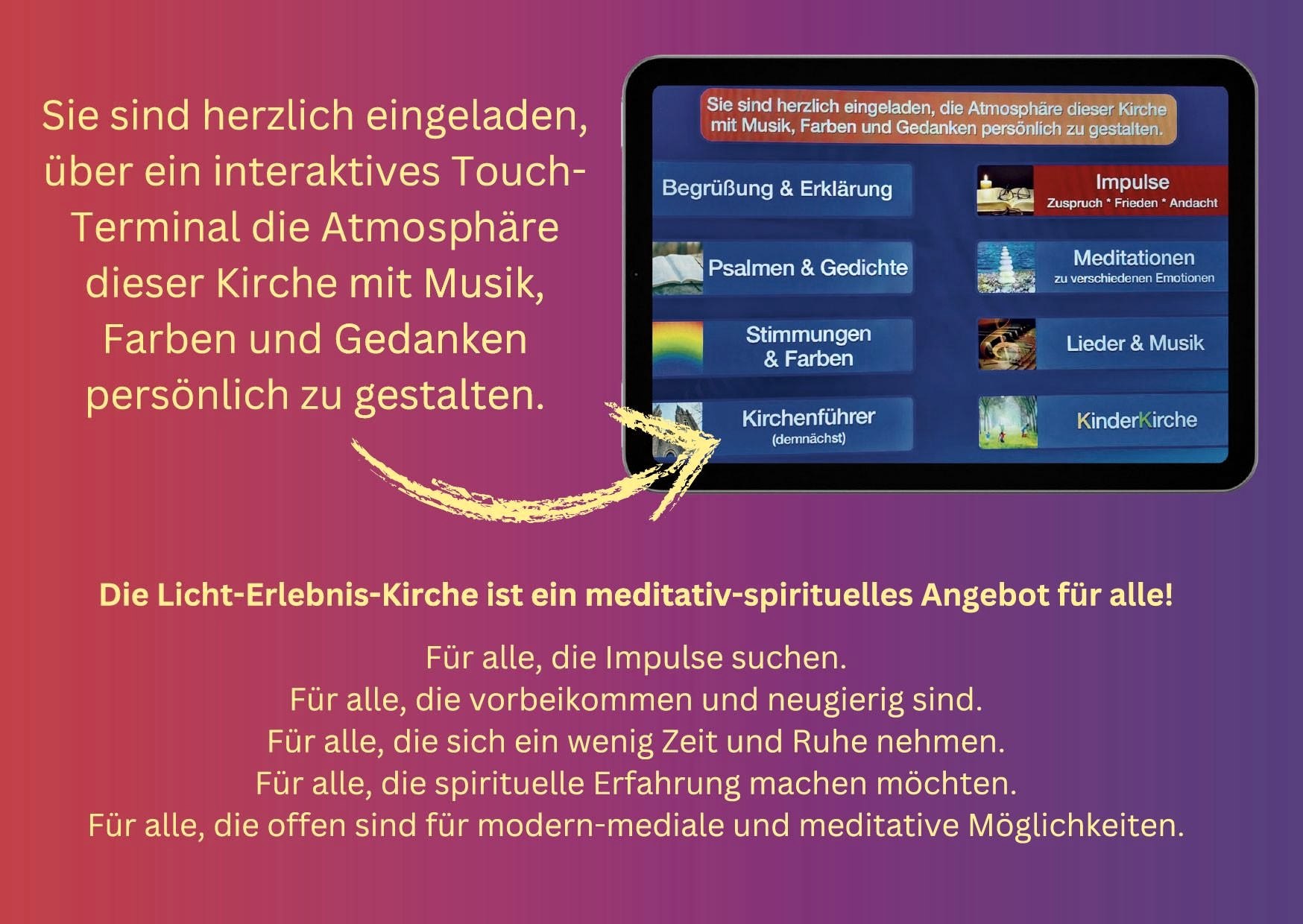 Ein neues, mediales Kirchensystem bietet zukünftig ein umfassendes Angebot für Einheimische und Touristen, die in einem Kirchenraum Ruhe, Besinnung und Zuspruch suchen. Am Eingangsbereich steht ein interaktives Touch-Terminal, das eine individuelle Nutzung eines inspirierenden Licht- und Audiosystems ermöglicht. Die Besuchenden können auf dem Monitor ein Thema, einen Text oder eine Musik auswählen, die dann mit eindrucksvollen Licht- und Toneffekten inszeniert werden. So kann jede:r eine persönliche Meditation gestalten, ausprobieren und erleben.