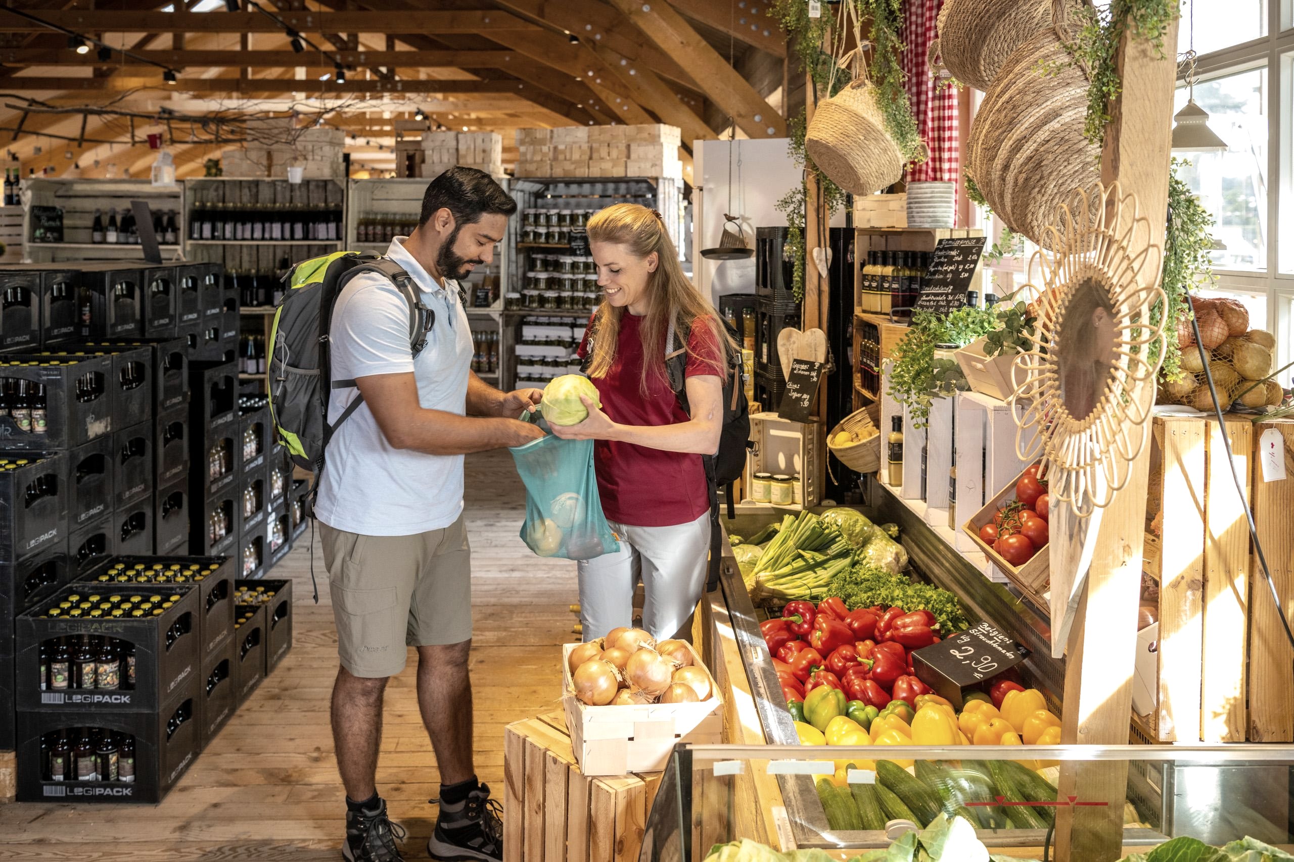 Das Warenangebot beinhaltet Obst und Gemüse, Käse, Frischfisch (bis 13:00 Uhr), Geflügel, Eier und Feinkost.